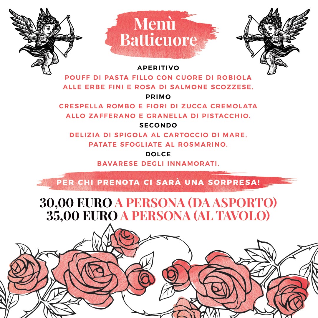 Prenota il tuo take away di San Valentino entro venerdì 12 febbraio 2021: basta chiamarci allo 06 89 02 05 47 oppure al 389 91 91 194.